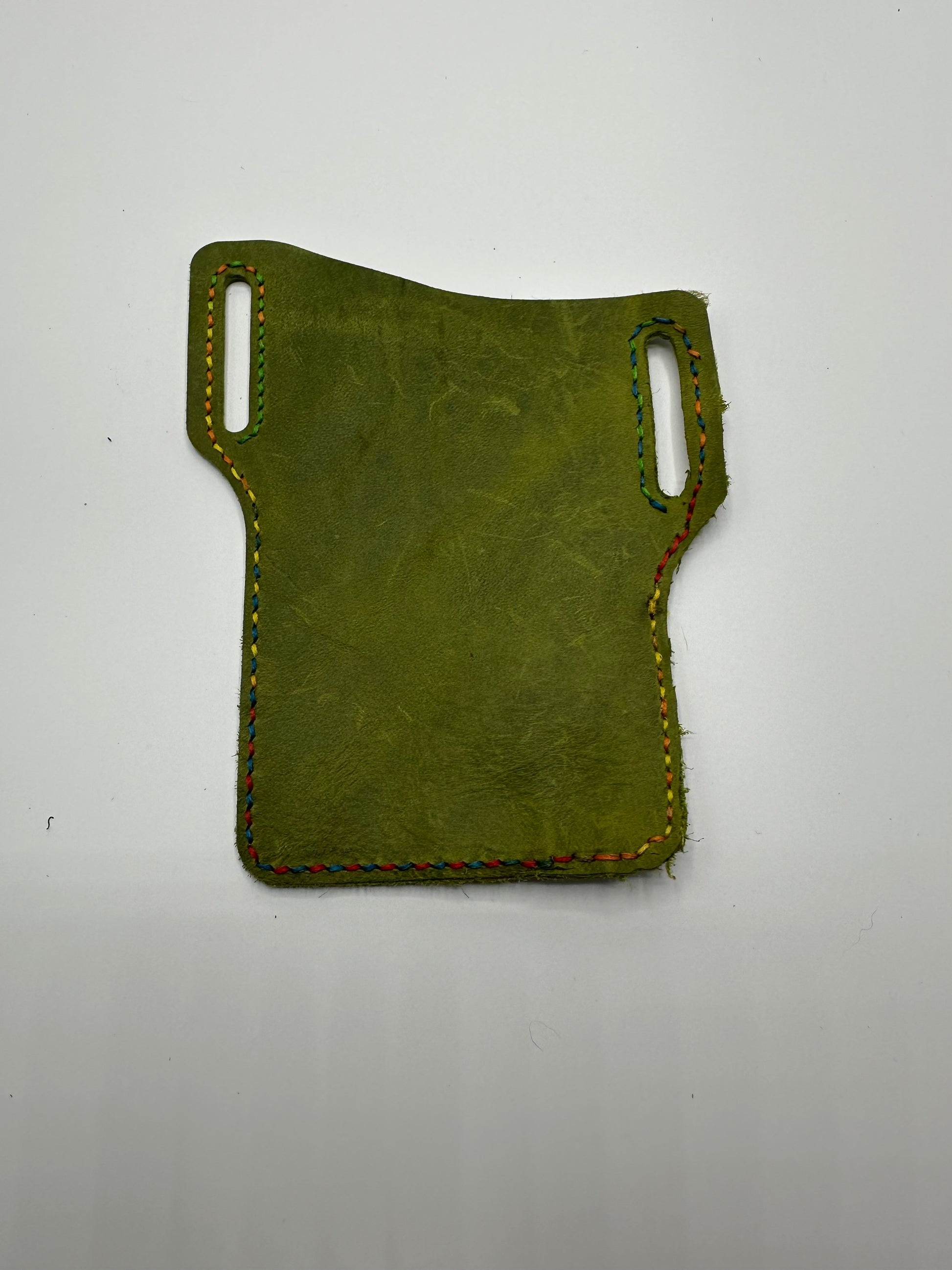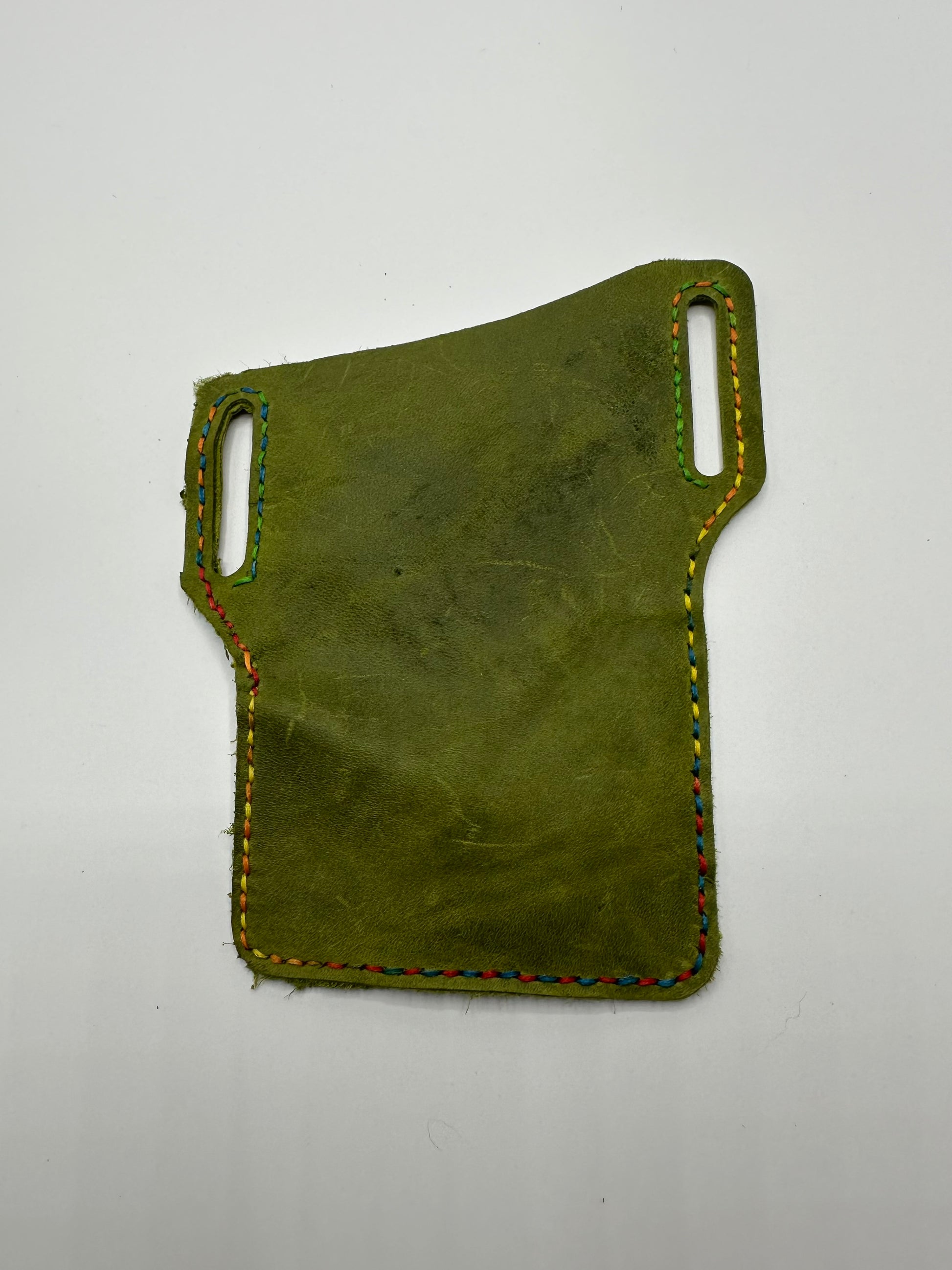 Beautiful hand stitched with soft supple leather and hand stitched with bright variegated thread. Put this through your belt loops for hands free carrying. This leather was recovered from industrial scraps. I buy these scraps by the pound and use as much from easy scrap as possible to reduce landfill waste while still providing a quality product. This piece is saddle stitched with variegated thread for a unique, durable product